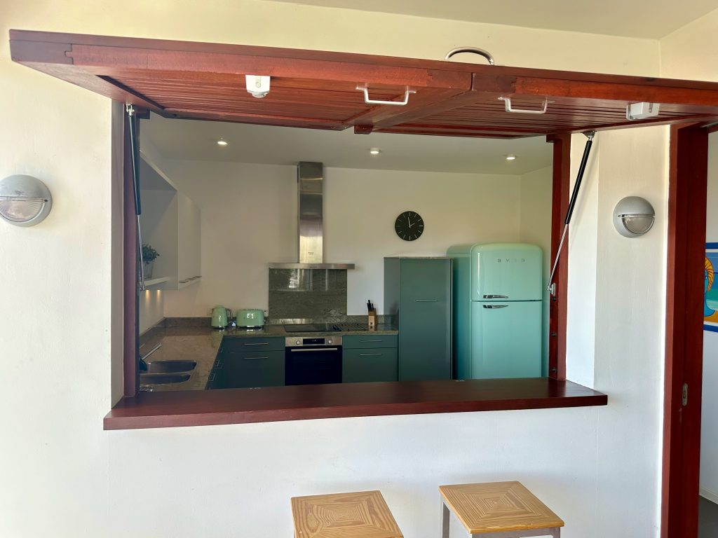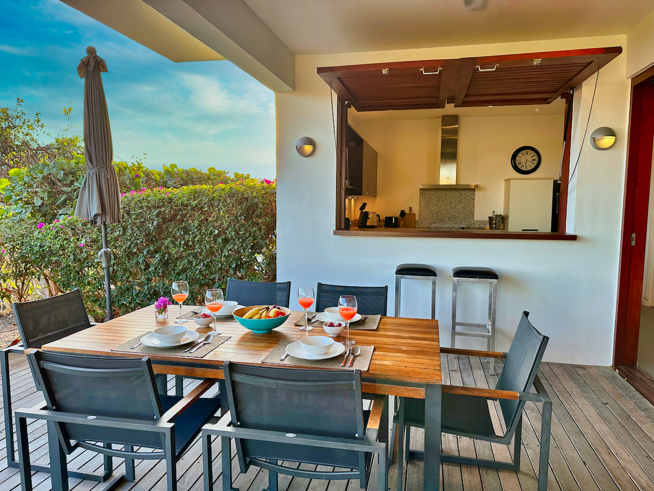 Wanneer de 2 riante schuifpuien van de woonkamer, de shutters en de kantelramen van de keuken geopend zijn lopen binnen- en buitenleven vloeiend in elkaar over. Zo krijgt u het comfortabele Caribische gevoel. De porch terrasoverkapping biedt op het zitgedeelte aangename schaduw gedurende de hele dag. Op het porch terras kunt u dus zelf kiezen voor de schaduw of juist de zon. Voor de korte periode in het jaar met lage zon in de namiddag is er nog een grote kantelbare bijpassende parasol. Het appartement kijkt vanaf de woonkamer, keuken en de porch uit over de tuin en de Caribische zee. Klik hier voor de indeling en een plattegrond van vakantiewoning appartement Sunrise 9 op Boca Gentil.