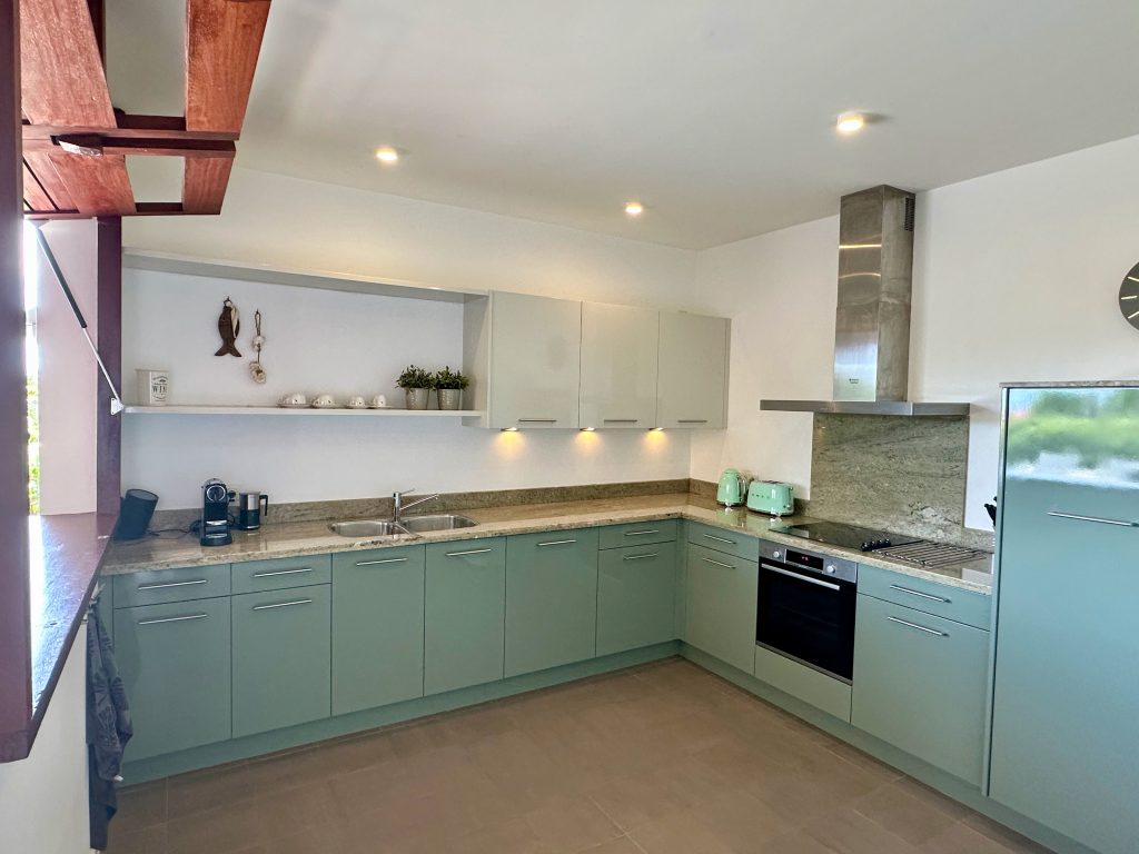 De keuken is ruim en van alle gemakken voorzien want er is voldoende en stijlvol bestek, servies, een Nespresso èn een Senseo koffiezetapparaat, glimlach opwekkende waterkoker van SMEG, oven, vaatwasser, broodrooster ook van SMEG, staafmixer, grillplaat en voor buiten op het terras een gas-barbecue. In het oog springend is de jaren 50 retro-moderne koel- en vries combi van SMEG (FAB50) in pastelgroen. Er is een aparte bijkeuken met wasmachine met opbergruimte voor uw zwem-, snorkel- of golfspullen.